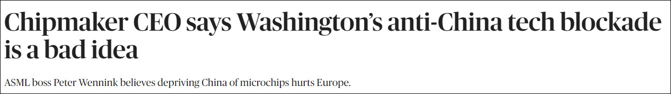 “如果你采取出口管制措施将中国市场拒之门外,这将迫使他们争取技术主权(tech sovereignty),就其真正的技术主权而言……在15年的时间里,他们自己将能够做出所有的这些东西,而且他们的市场(针对欧洲供应商的市场)将彻底消失。”温彼得在阿斯麦总部所在地——荷兰费尔德霍芬接受采访时作出该表述。
